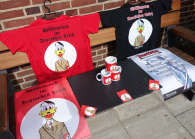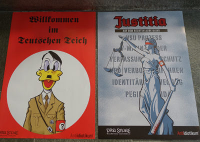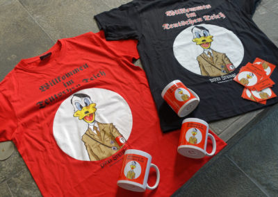 Aufkleber Set Adolf Duck €4,00 Graphic Novel „Drei Steine“ €19,99 Graphic Novel Drei Steine handsigniert mit Zeichnung €35,00 Poster Adolf Duck A2 €8,00 Poster Justita A2 €8,00 T-Shirt Adolf Duck rot €20,00 T-Shirt Adolf Duck schwarz €20,00